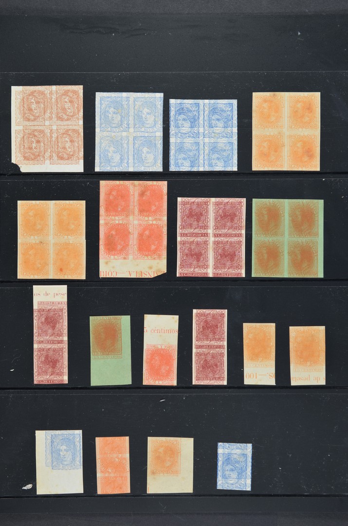SPANJE, 1870, Hispania, partijtje met paren en blokken, veel dubbeldrukken en variëteiten, waarbij met keur Saeftel.
