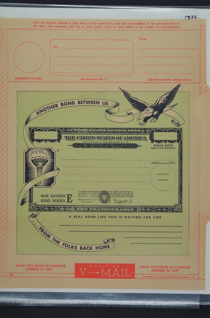 TWEEDE WERELDOORLOG, V-mail. Vijf V-mailstukken 1943-45 verzonden naar de USA of Engeland, beschreven op bladen, alsmede fraai ongebruikt postblad '... from the Folks back home'