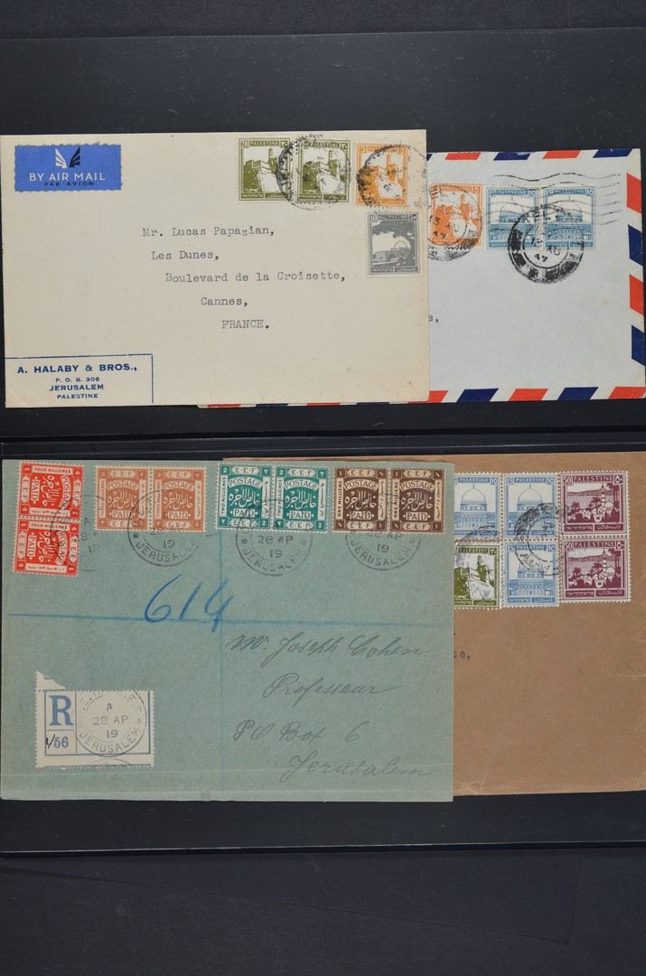 PALESTINA, Posthistorie 1919-1947, 22 gelopen brieven en postwaardestukken, waarbij goede frankeringen.