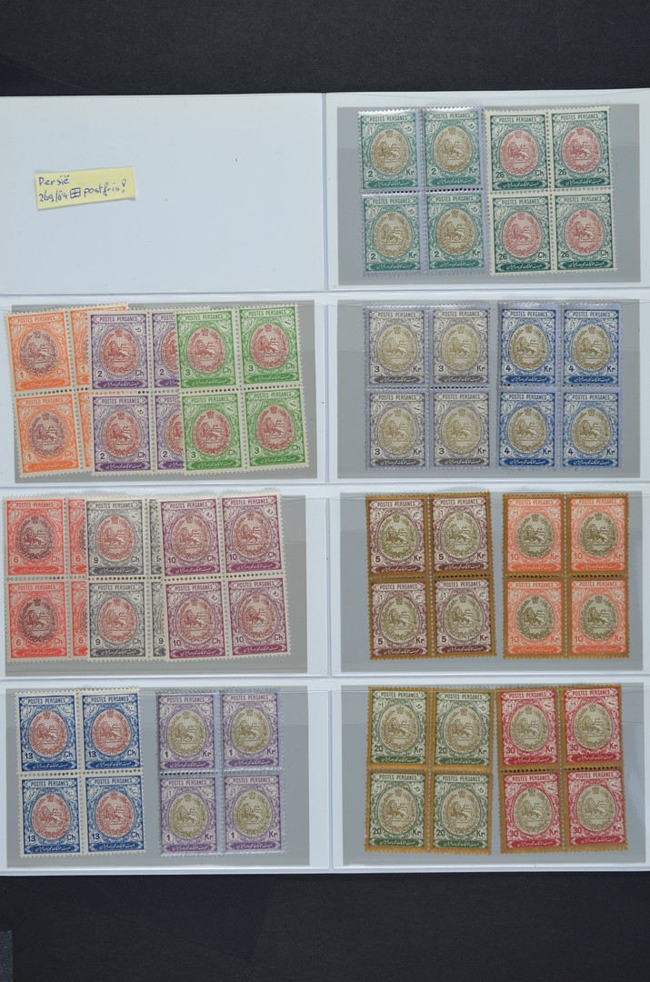 PERZIË-IRAN */** op kaartjes, waarbij Mi.nrs. 40/42, 288/302 in postfrisse blokken van vier, alsook div. handstempel en andere opdrukken periode 1902-1918. Ondanks enkele twijfelachtige ex., een prachtkoop met enorme cataloguswaarde!