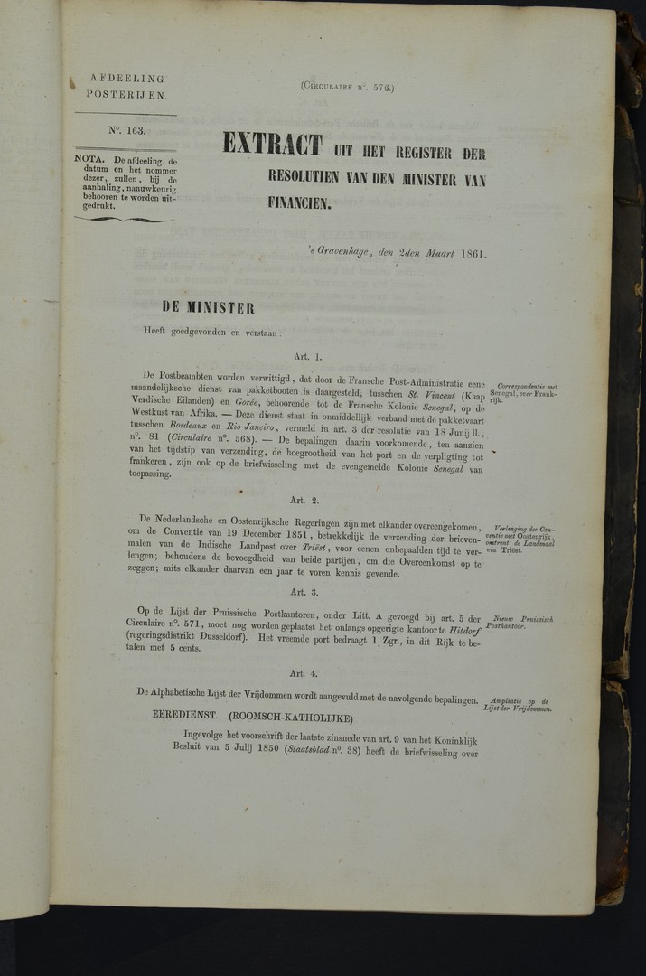 LITERATUUR. Circulaires 575 (1861)-617 (1864) betreffende de Nederlandse Posterijen, gebundeld in boek met beschadigde kaft, doch inhoud in prima staat. Waardevol voor de bibliotheek van elke posthistoricus
