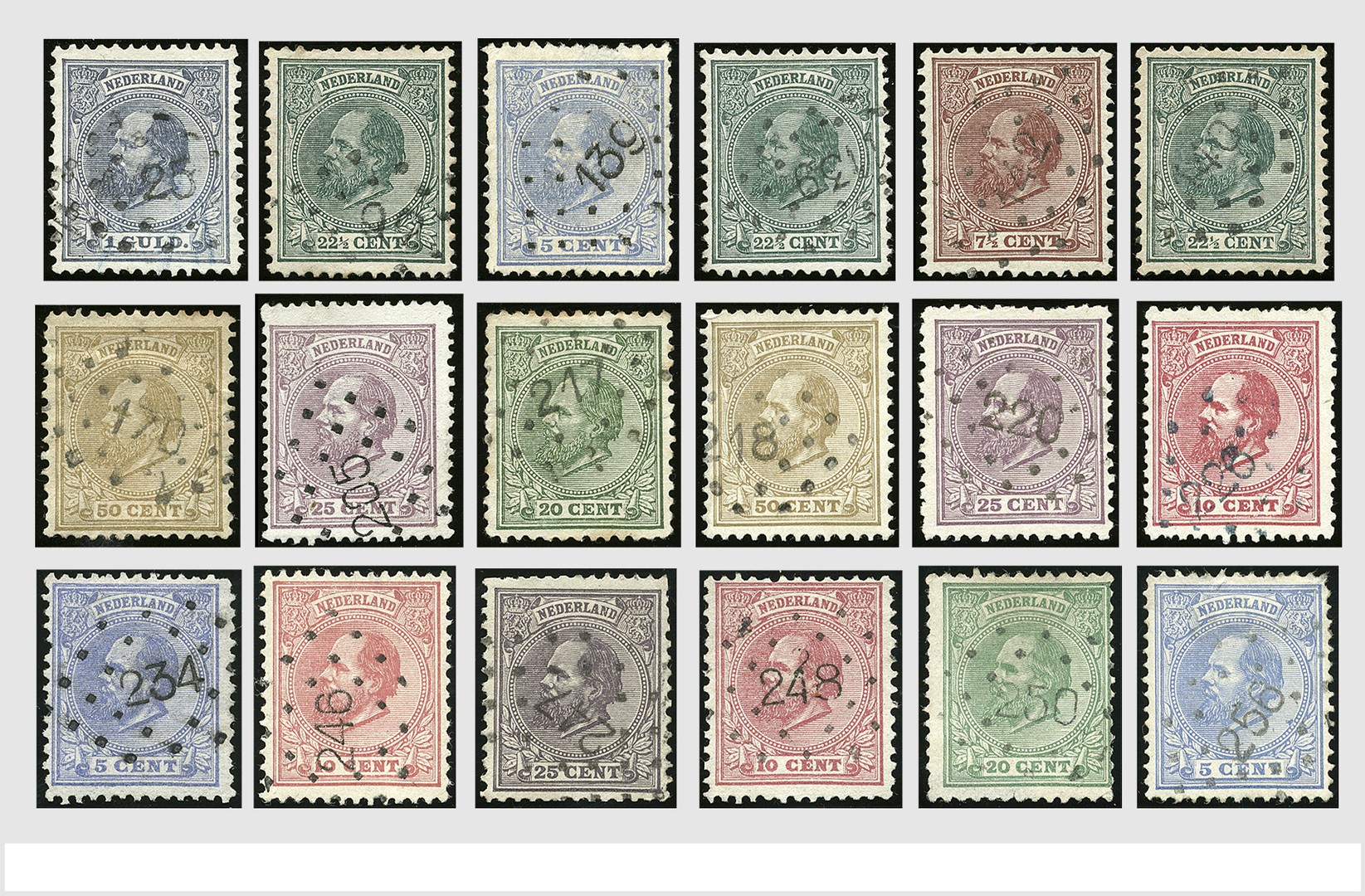 NEDERLAND - PUNTSTEMPELS op emissie 1872, tussen nummer 1 en 256, op 5 cent t/m 1 gulden. Circa 1200 verschillende, waarbij diverse betere en hooggenoteerde ex. in doorgaans prima kwaliteit. De Cataloguswaarde + Stempelwaarde bedraagt volgens inzender een kleine € 25.000