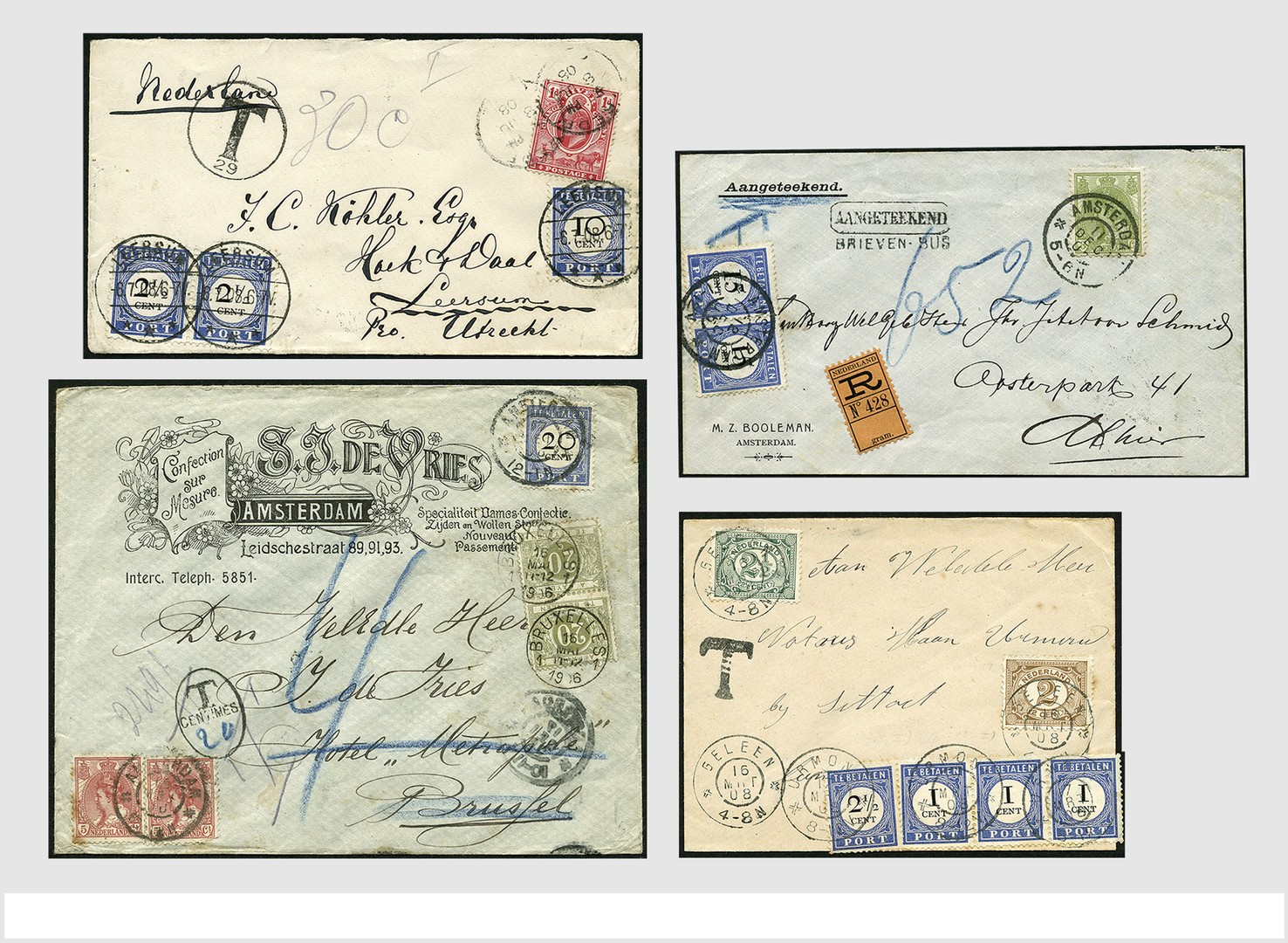 POSTHISTORIE. PORT. Bijzondere verzameling van 53 mooie poststukken waarop donkerblauwe portzegels van emissie 1894 (op 2 stukken ook andere portzegels) w.o. ontoereikend gefrankeerd uit binnen- en buitenland, geweigerd, beport in binnen- en buitenland w.o. Vluchtoord Ede, aan port onderworpen dienststukken, doorgezonden, afgeschreven, diverse administratieve stempels en notities, in Safe-ringband. Prachtobject!