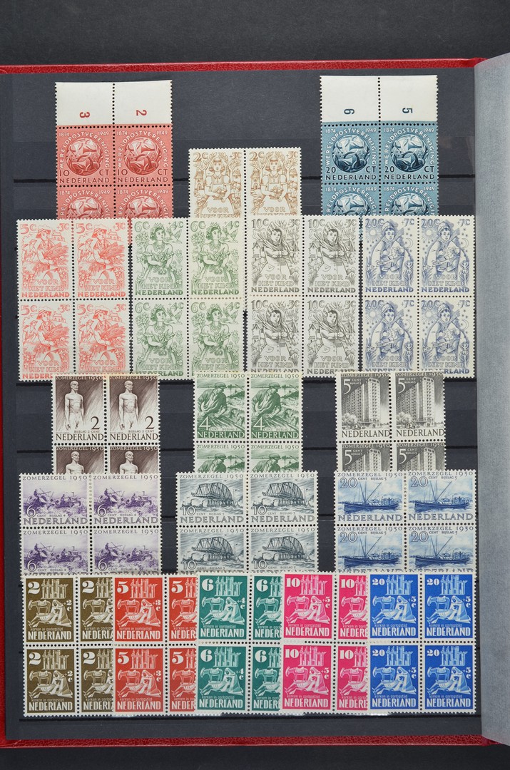 Verzameling blokken van 4, meest postfris en naoorlogs, waarbij veel goede series zoals 474/489, Zomer en Kerken 1950, Itep, etc. In 3 insteekboeken.