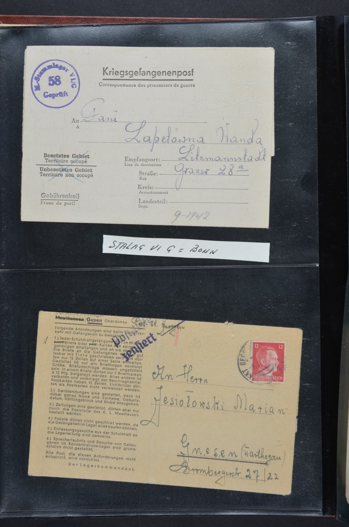 TWEEDE WERELDOORLOG KAMPPOST. 168 Kamppoststukken, voorgedrukte briefkaarten w.o. met aanhangende antwoordkaart, postbladen, enveloppen waarvan diverse nog met inhoud, ontvangstbevestigingen pakketten, afkomstig van een grote verscheidenheid aan concentratiekampen w.o. Auschwitz, Buchenwald, Dachau, Mauthausen en Ravensbrück, naar diverse bestemmingen w.o. Nederland, Palestina en België met meerdere stukken via het Rode Kruis, met vele typen censuurstempels, poststempels, etc. in 2 albums. Uitzonderlijke collectie en in dergelijke omvang en verscheidenheid zelden aangeboden