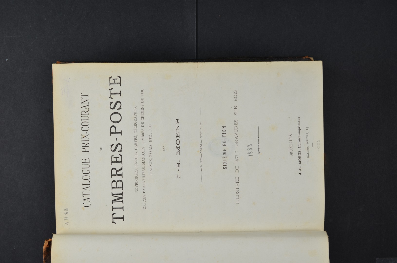 LITERATUUR. Catalogue Prix-Courant de Timbres-Poste, sixième édition (1883), J.-B. Moens. Postzegels, postwaardestukken, spoorweg- en fiscaalzegels, etc. In prima staat, harde kaft, rug met goud op snee. Zeldzaam boekwerk!