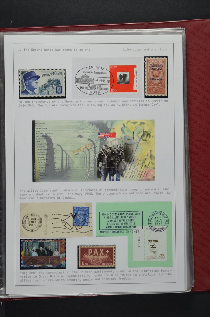 MOTIEF: NATO - FROM DEFENDER TILL INTERNATIONAL INTERVENER. Internationaal met Groot Zilver bekroonde tentoonstellingscollectie van P. Alderliesten, bestaande uit zegels (w.o. ontwerp type Heuss, foutdruk), poststukken, briefstukjes, labels, bijzondere stempels w.o. van S.H.A.P.E. en propaganda, slogans, etc. betreffende o.a. het voorspel, ontstaan NAVO, Russische expansiedrift, Oost- en West-Duitsland, NAVO vs. Warschaupact, Civiele en Militaire acties, inval Hongarije, en 'Hope for the Future', alles zeer goed gedocumenteerd beschreven in het Engels, opgezet op in totaal 96 bladen (1e blad uitleg, 16 wisselbladen), in 5 ringbanden. Prachtcollectie van internationale allure!