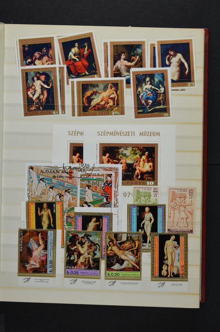 MOTIEF: Vrouwen op postzegels. Verzameling in 3 insteekboeken, waaronder oudere zegels doch hoofdzakelijk bestaande uit veel ondeugend naakt op schilderijen, waarvan oude verzamelaar afstand doet zodat ook jongere verzamelaars hiervan kunnen genieten