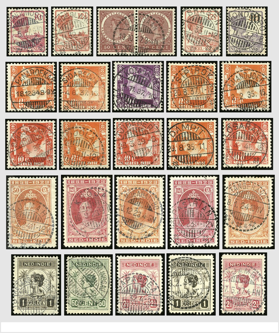 NED.- INDIË. Langebalkstempels (LB), op bladen opgezette verzameling van verschillende typen op losse zegels van diverse vooroorlogse emissies en waarden, w.o. veel mooie afstempelingen, wat schaarse typen en kantoren als Digoel, Enrekang, Kawali, Larat, Lintido, Moearasiberoet, Penoeba, Samalanga, Sapat, Seroei, Tawangmangoe, etc. Mooie startverzameling om opnieuw op te zetten en uit te breiden