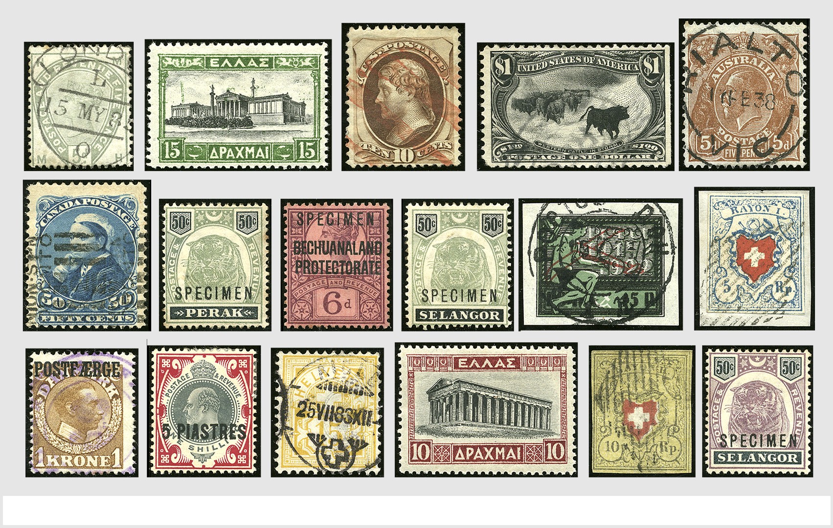 WERELD o/*/**, in 12 insteekboeken en schriftje met vele goede nrs. (zie fotocollage), o.a. Engelse en Portugese Koloniën, Griekenland, Zwitserland, etc.