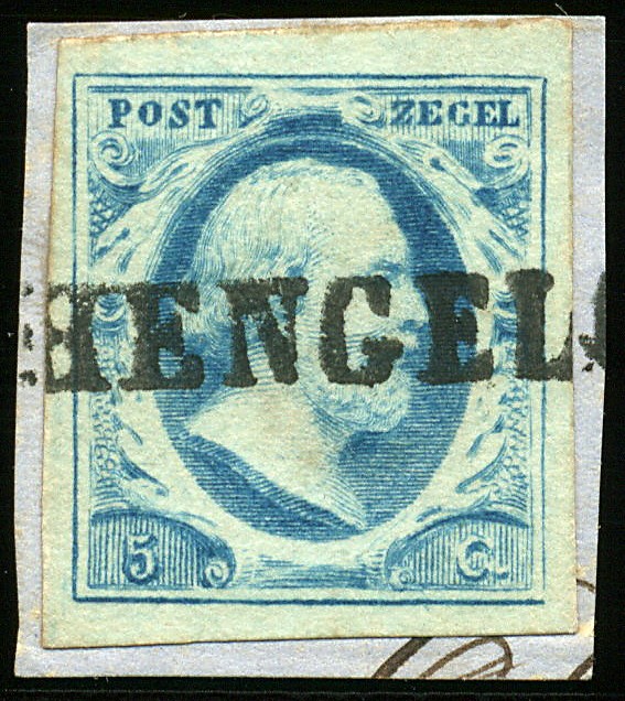 HENGELO (EY.125) op 5 cent blauw nr. 1o, plaat V pos. 59. Prachtex. op briefstukje met bijzonder mooie, duidelijke afst. Het betreft Hengelo in ons schone en nijvere Twente (PEP1 7140-02). Ex Klink
