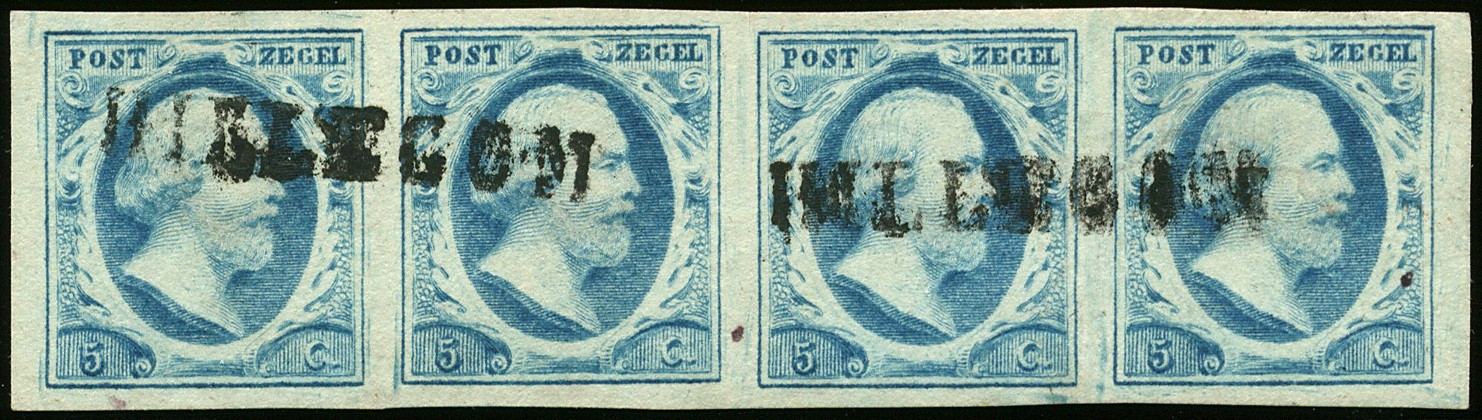 HILLEGOM (EY.100) OP 5 CENT BLAUW NR. 1l, PLAAT IV POS. 16/19. SUPERBE STRIP VAN VIER MET TWEE VOLLEDIGE AFST.