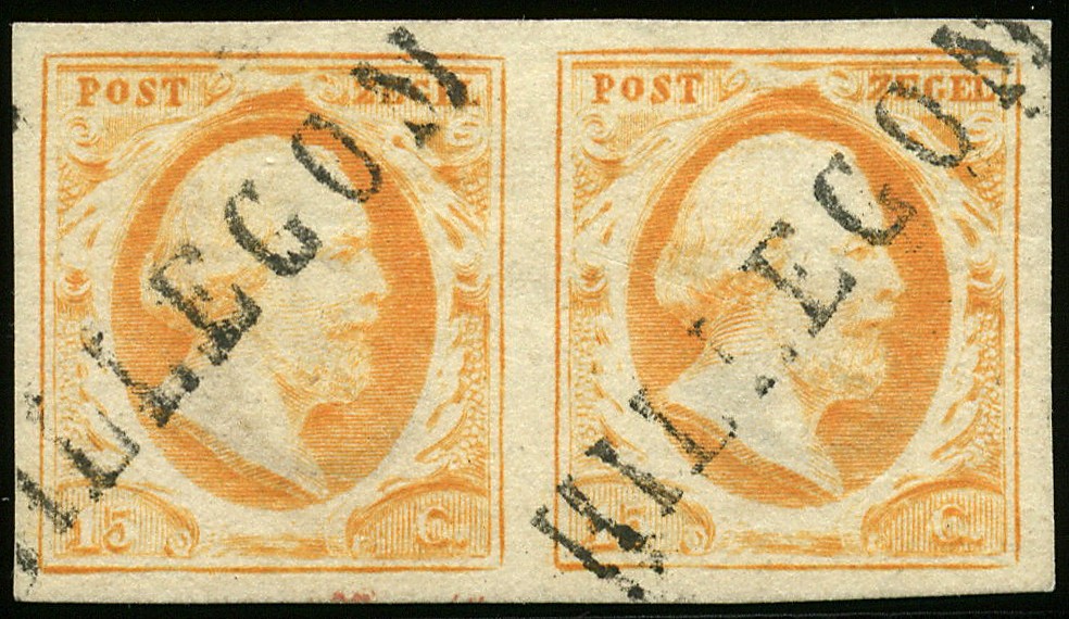 HILLEGOM (EY.250) op 15 cent oranjegeel. Luxe paar met twee diagonale afst. Zeldzaam! Ex Klink