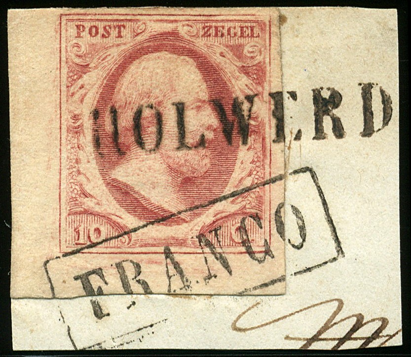 HOLWERD in zwart (EY.R) op 10 cent rood nr. 2l, plaat VI pos. 46. Enorm hoekstuk op briefstukje waarop prachtige afdruk met tevens Franco in kader. Ex van Kimmenade
