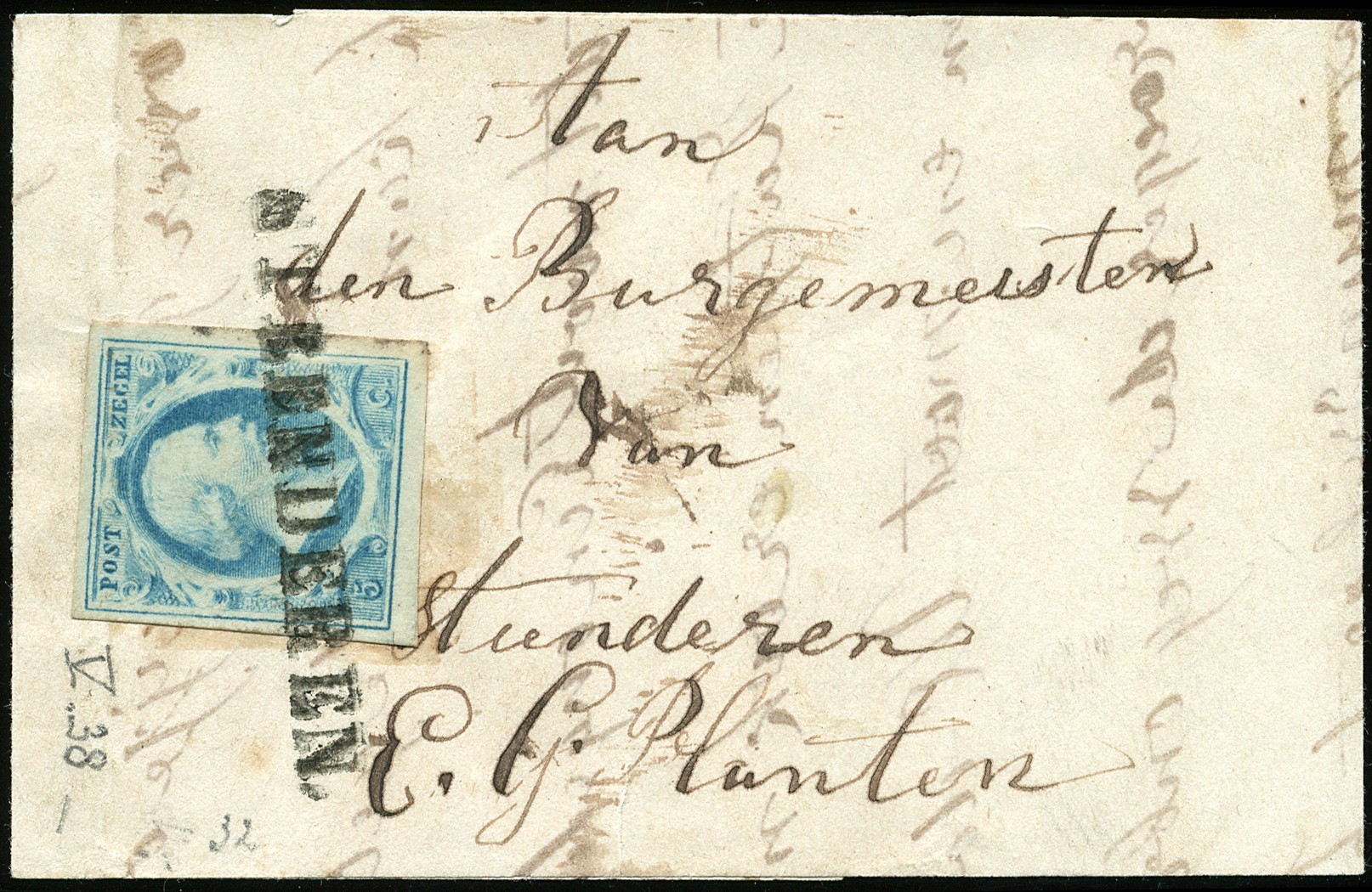 STEENDEREN (EY.RR) op 5 cent lichtblauw nr. 1o, plaat V pos. 38. Prachtex. waaroverheen mooie afdruk van dit uiterst zeldzame naamstempel op groot, ongedateerd brieffragment. Ex Wolff de Beer