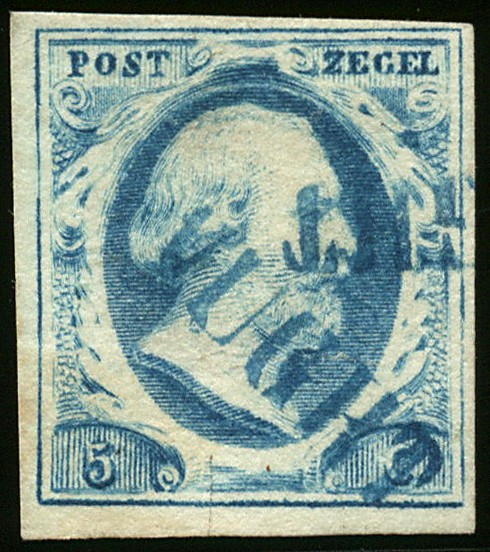VUGHT in blauw (EY.RR) op 5 cent blauw. Prachtex. (bovenrand rechts iets smal) met twee afst. waaronder een volledig. Uitermate zeldzaam! Ex van Kimmenade