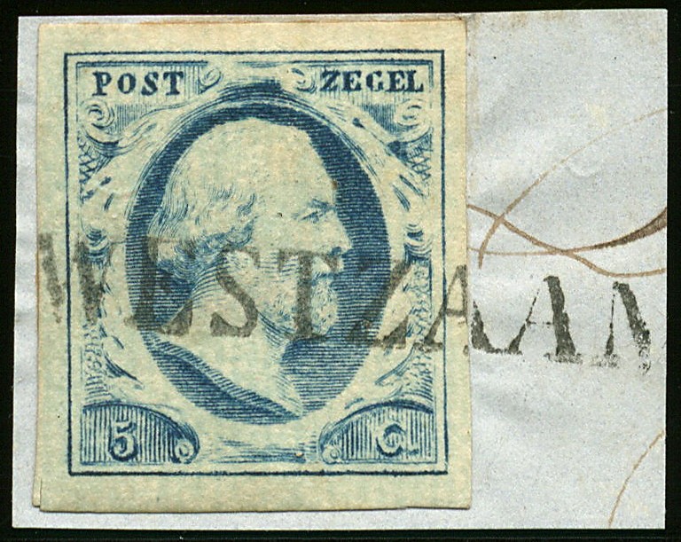 WESTZAAN (EY.125) op 5 cent blauw. Breed gerande prachtzegel op briefstukje waarop volledige afst. Ex van Dieten