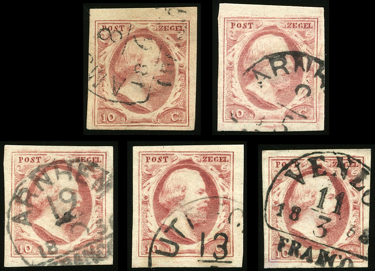 2h, 10 Cent plaat V vroege druk, 15 losse zegels uit het linker boven kwadrant van een plaatreconstructie, posities 1 (2x), 2, 3, 4, 6, 8, 9, 12, 13, 14, 16, 18, 22 en 24. Prachtexemplaren in uitgezochte kwaliteit. € 900