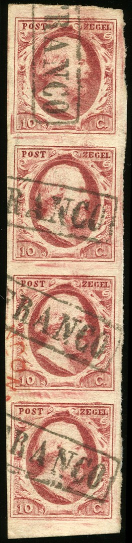 2o-Pl.IX-32/37/42/47. Zeer breed gerande verticale strip van vier, met fragment rode afstempeling London. € 900