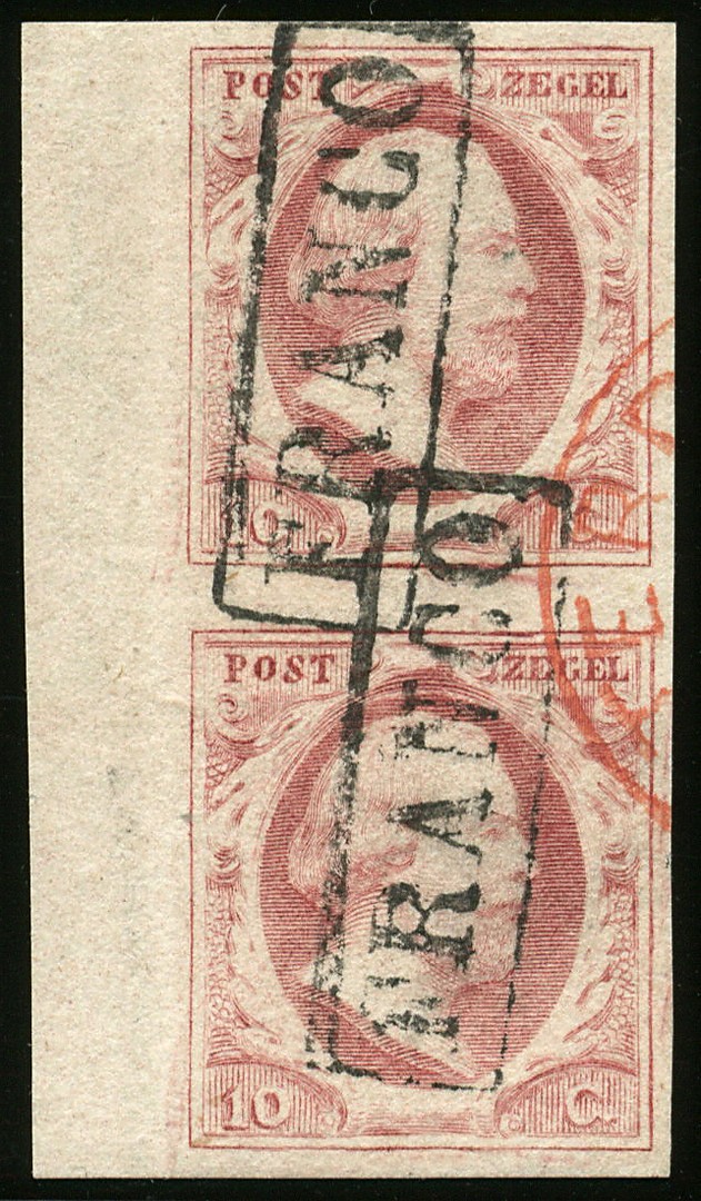 2p-Pl.X-81/86. Prachtig verticaal randpaar, met rood fragment van een groot postkantoor. Mogelijk is de brugvouw wat gladgestreken