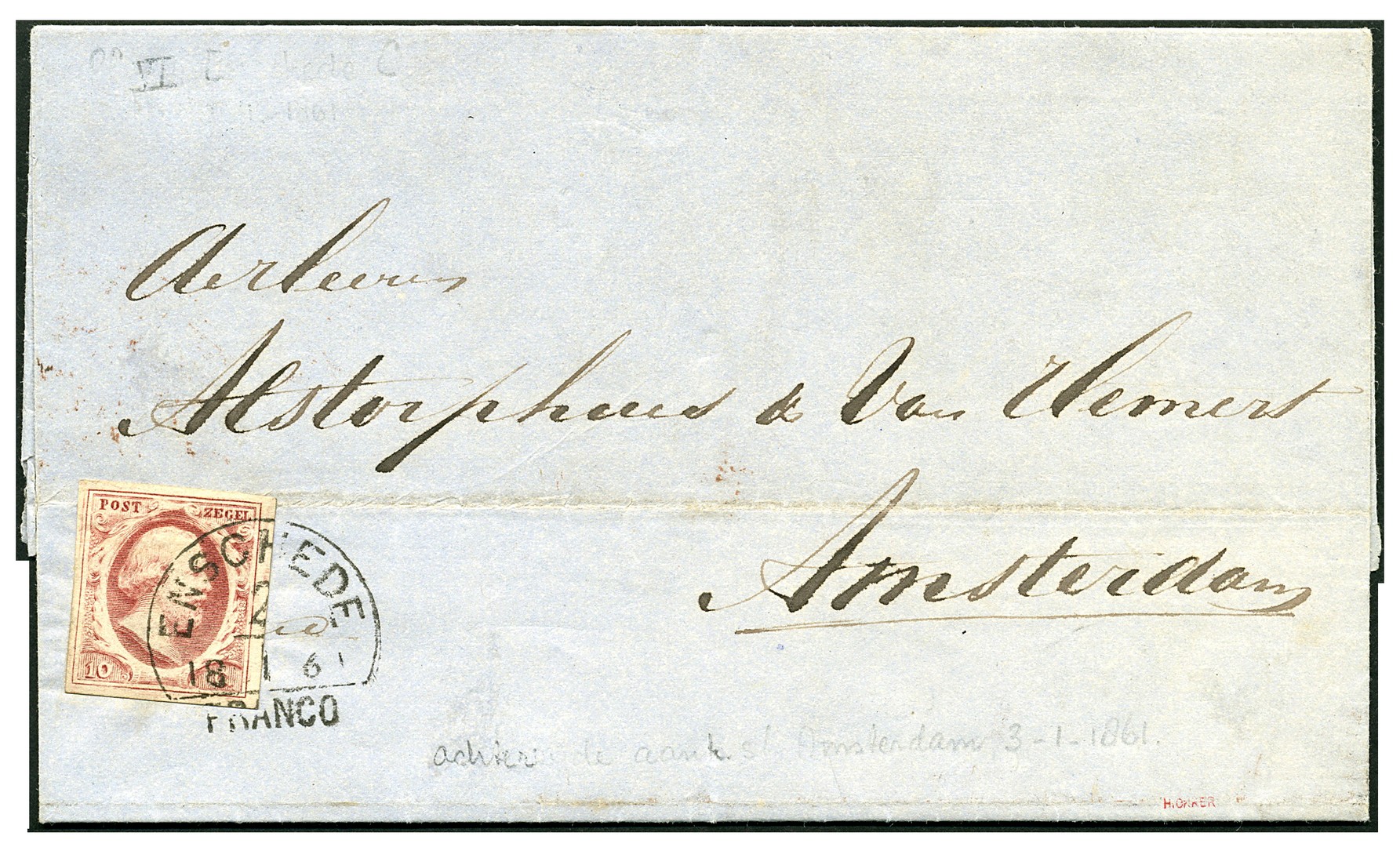 ENSCHEDE C (EY.100) op 10 cent rood nr. 2l-Pl.VI-28. Prachtex. op complete vouwbrief van 2-1-1861 naar de firma Alstorphius & Van Hemert te Amsterdam 3-1