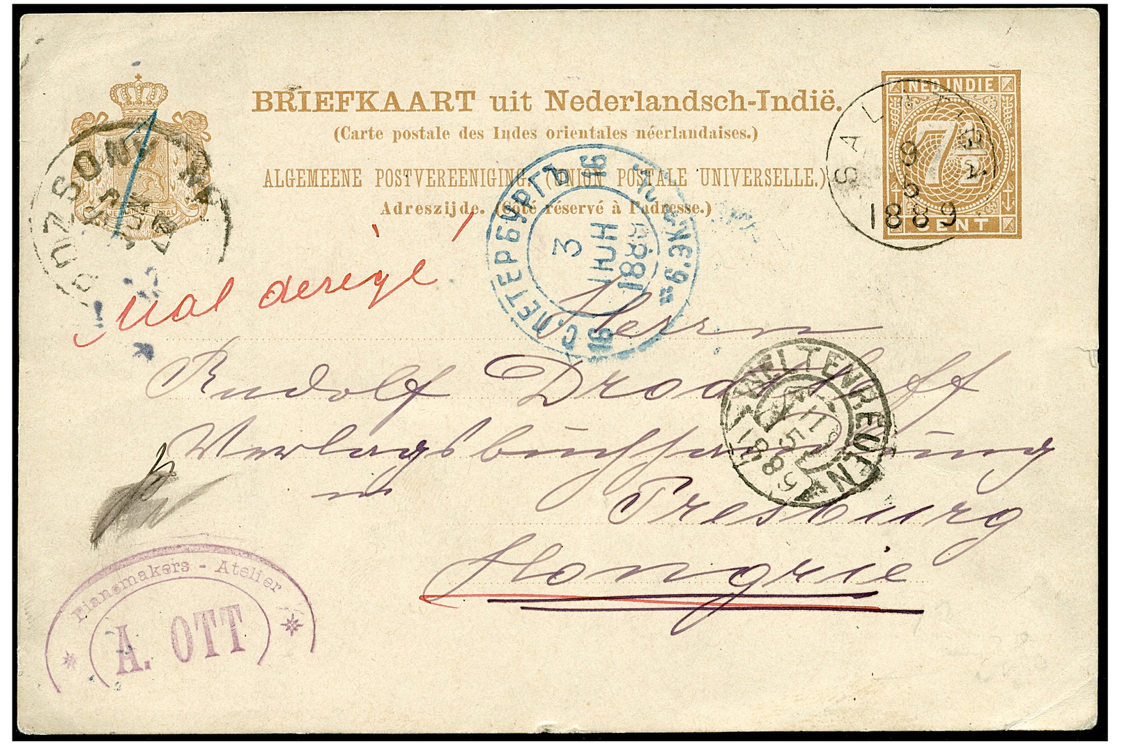 OOSTENRIJK-HONGARIJE. Bk. G9 van Salatiga 9-5-1889 over Weltevreden 11-5 per abuis naar St. Petersburg 3-6, met rode pen geschreven ‘mal derigé’ en doorgez. naar de juiste bestemming Presburg/Pozsony (nu: Bratislava) in ‘Hongrie'. Tevens bijgevoegd prentbk. van Presburg uit 1903