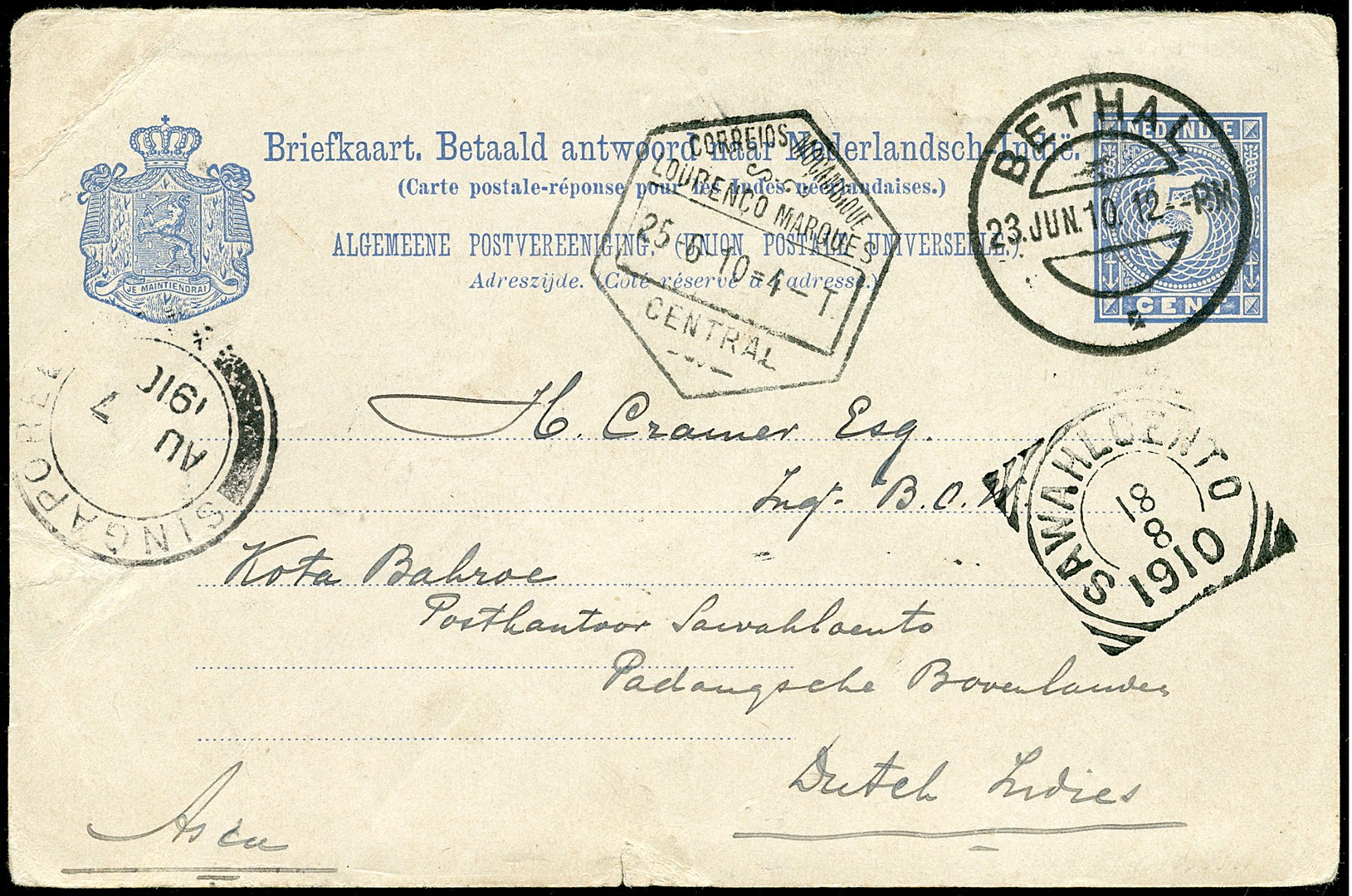 AFRIKA. ZUID-AFRIKA. Bk. G11 (A-kaart, met ‘gebruikssporen’) van Bethal 23-6-1910 via Standerton 17-6 en Lourenço Marques (Mozambique) 25-6 over Singapore 7-8 en Sawahloento 18-8 naar een ingenieur B.O.W. te Kota Bahroe (az. diverse stempels). Bijzonder aantrekkelijk poststuk!