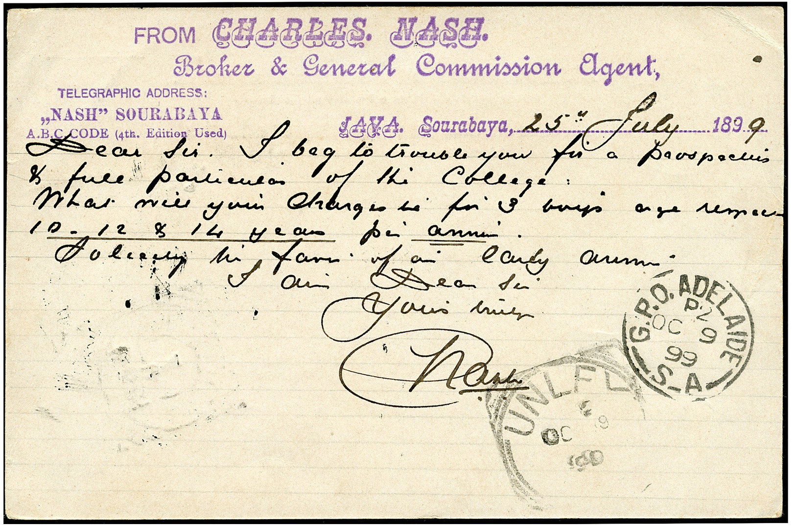 AUSTRALIË. Bk. G12 van Broker & General Commission Agent Charles Nash te Soerabaja 5-8-1899, over Weltevreden en Unley 9-10 naar Adelaide 9-10 (stempels az.)
