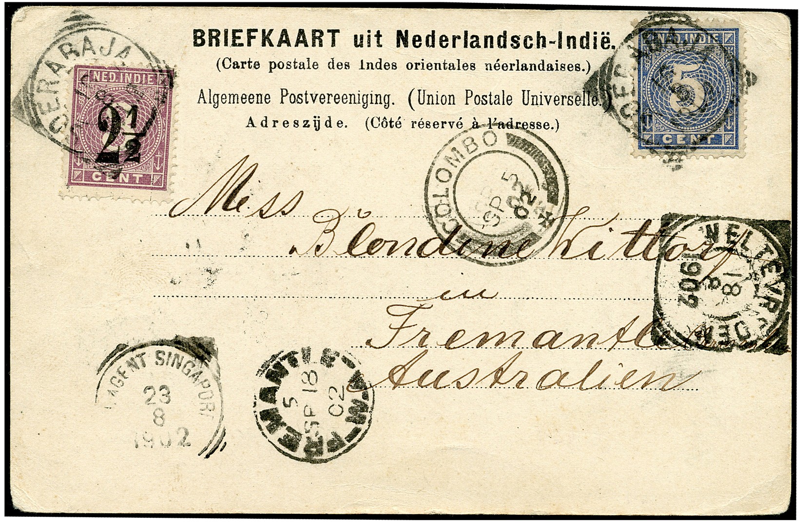 AUSTRALIË. Prentbk. gefr. met 2½c en 5c van Soerabaja 16-8-1902 via Weltevreden, de N.I.Agent Singapore 23-8 en Colombo 5-9 over Perth 18-9 naar Miss Blondine te Fremantle 18-9. Tevens prentbk. gefr. met ½c BB en 2c van Fort de Kock 17-8-1908 naar Woolloongabba, Queensland (geen as.)