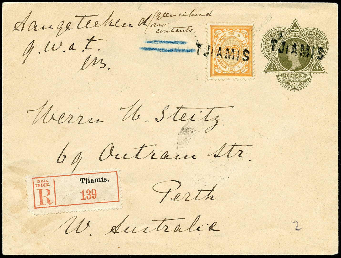 AUSTRALIË. Env. G28 bijgefr. met 3c (½c te veel) van TJIAMIS aangetekend via Singapore 7-10-1911 en Fremantle 31-10 naar Perth 31-10
