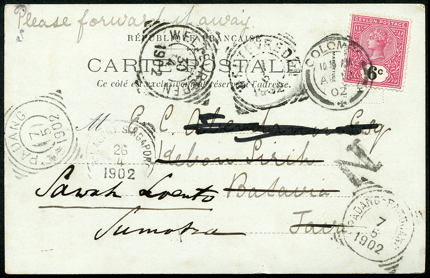 CEYLON. Briefkaarten uit Colombo (1890, 1895, 1902 en 1906), uit Colpetty (1904) en Havelock-Town (1908), met twee oude prentbk.