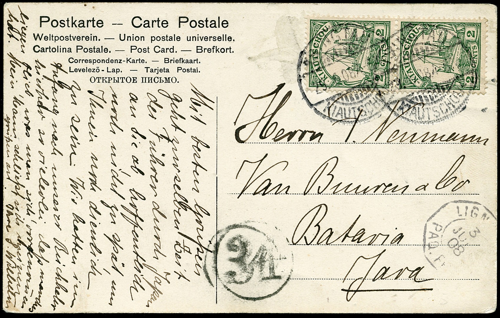 CHINA. Duitse kolonie Kiautschou. Prentbk. gefr. met 2c in paar van Tsingtau 29-6-1908 met de Franse pakketboot naar Batavia