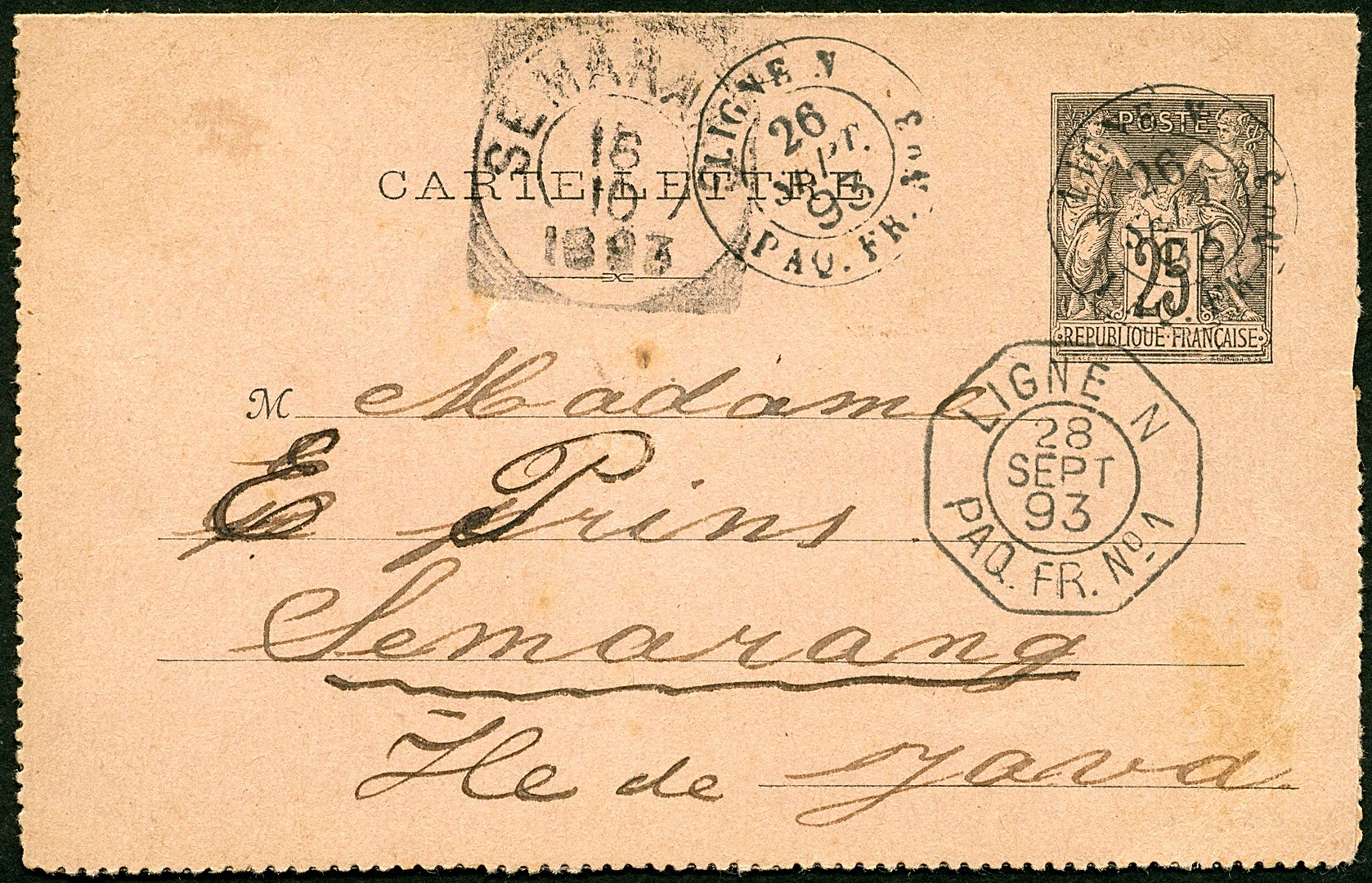 SCHEEPSPOST. LIGNE N. Frans postblad van 25c aan boord geschreven van de pakketboot no. 3 van de Ligne N 26-9-1893, te Aden op 26-9 verder met pakketboot no. 1 van de Ligne N 28-9 naar Semarang 16-10