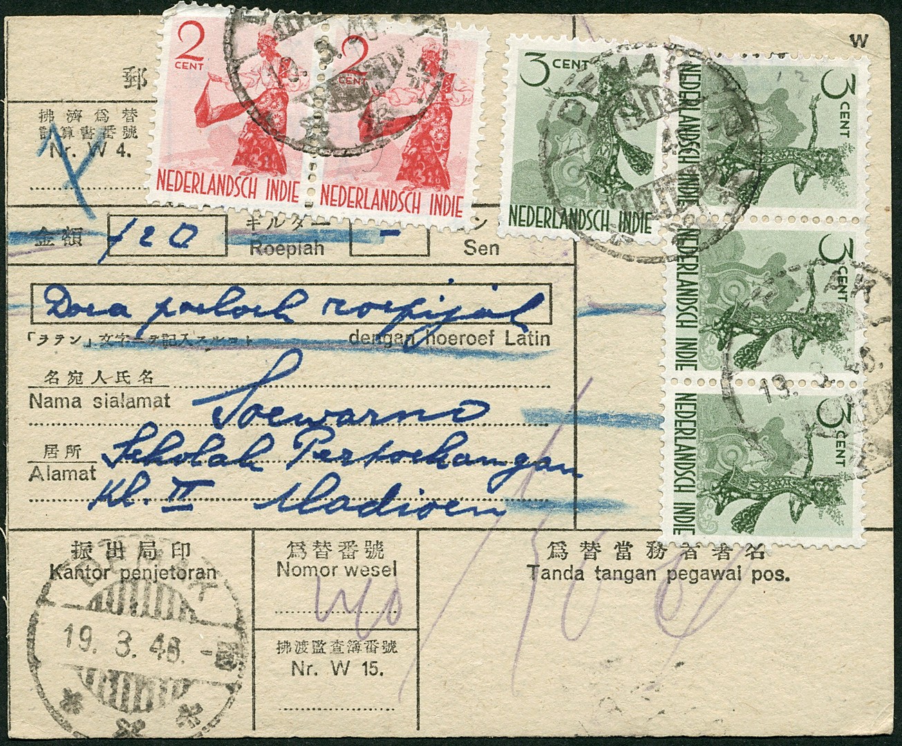 JAVA. Complete Money Order Bu.RF3a bearing 2c dancer no. 66 (two pairs of which one on the back) and 3c dancer no. 68 (strip of three and single) from Demak 19.3.46 to Madioen 23.3.46