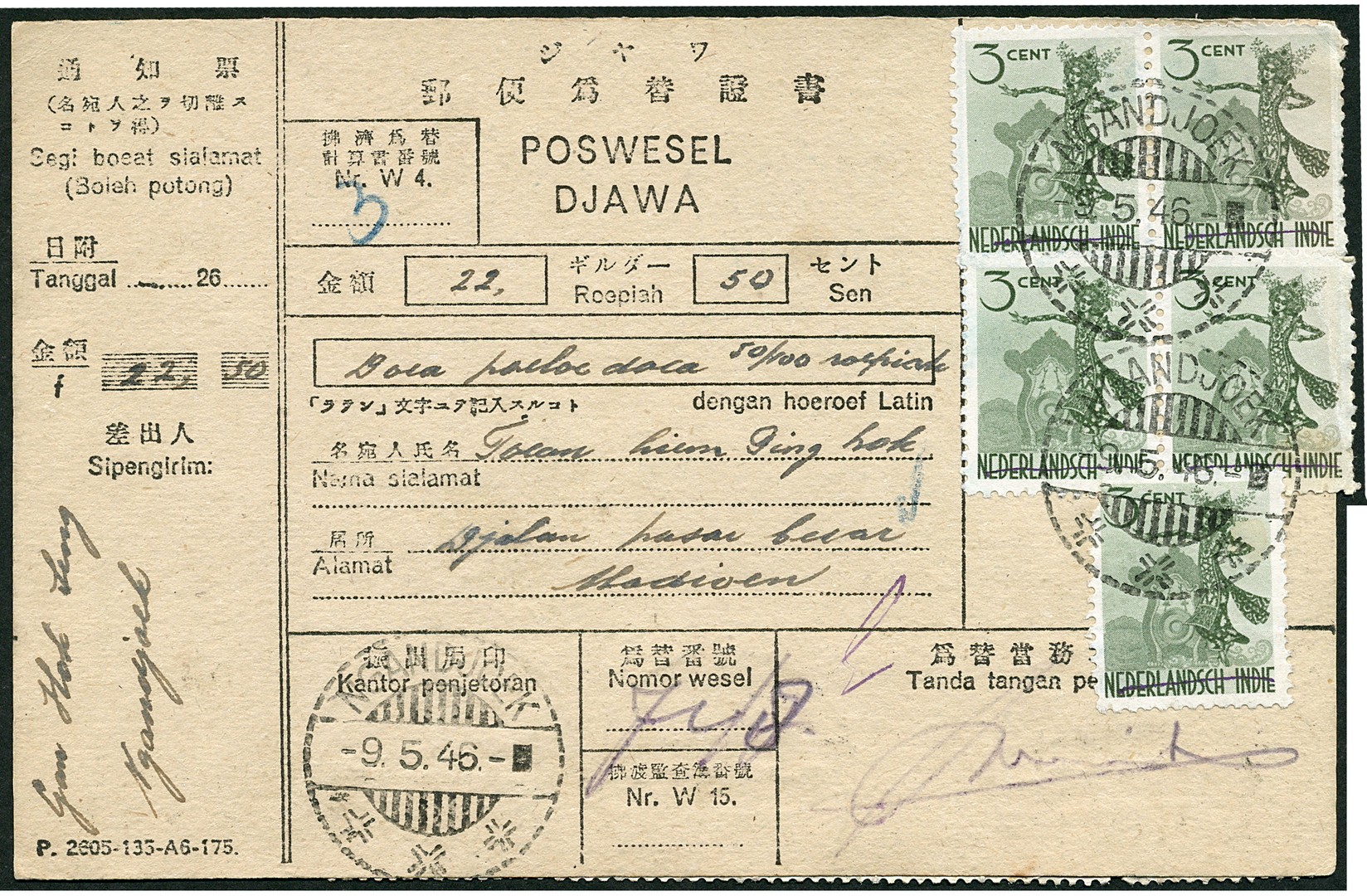JAVA. Complete Money Order Bu.RF3a bearing 3c dancer no. 68 (two pairs, right stamps small faults, and a single) and 2c dancer no. 66 on the back (strip of four and a single), all stamps with pencil line through country name, from Ngandjoek -9.5.46 to Madioen 13.5.6.