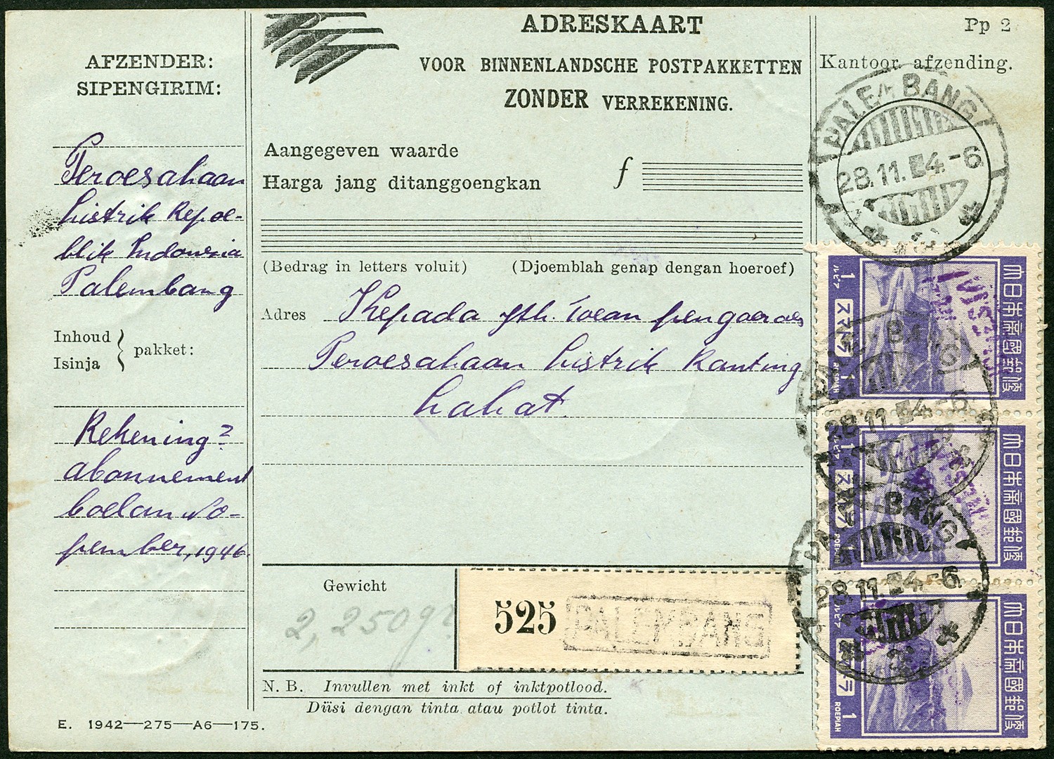 SUMATRA. 10 Cent van Konijnenburg with machine T and REP. IN- / DONESIA overprint no. 54v-92z-43' (on the back) and 1 roepiah definitive with REP. IN- / DONESIA overprint no. 54v-97 (7x, 4 on the back) on complete parcel post card Bu.RF40 (scarce) from Palembang 28.11.4.-6 to Lahat 30.11.46.-