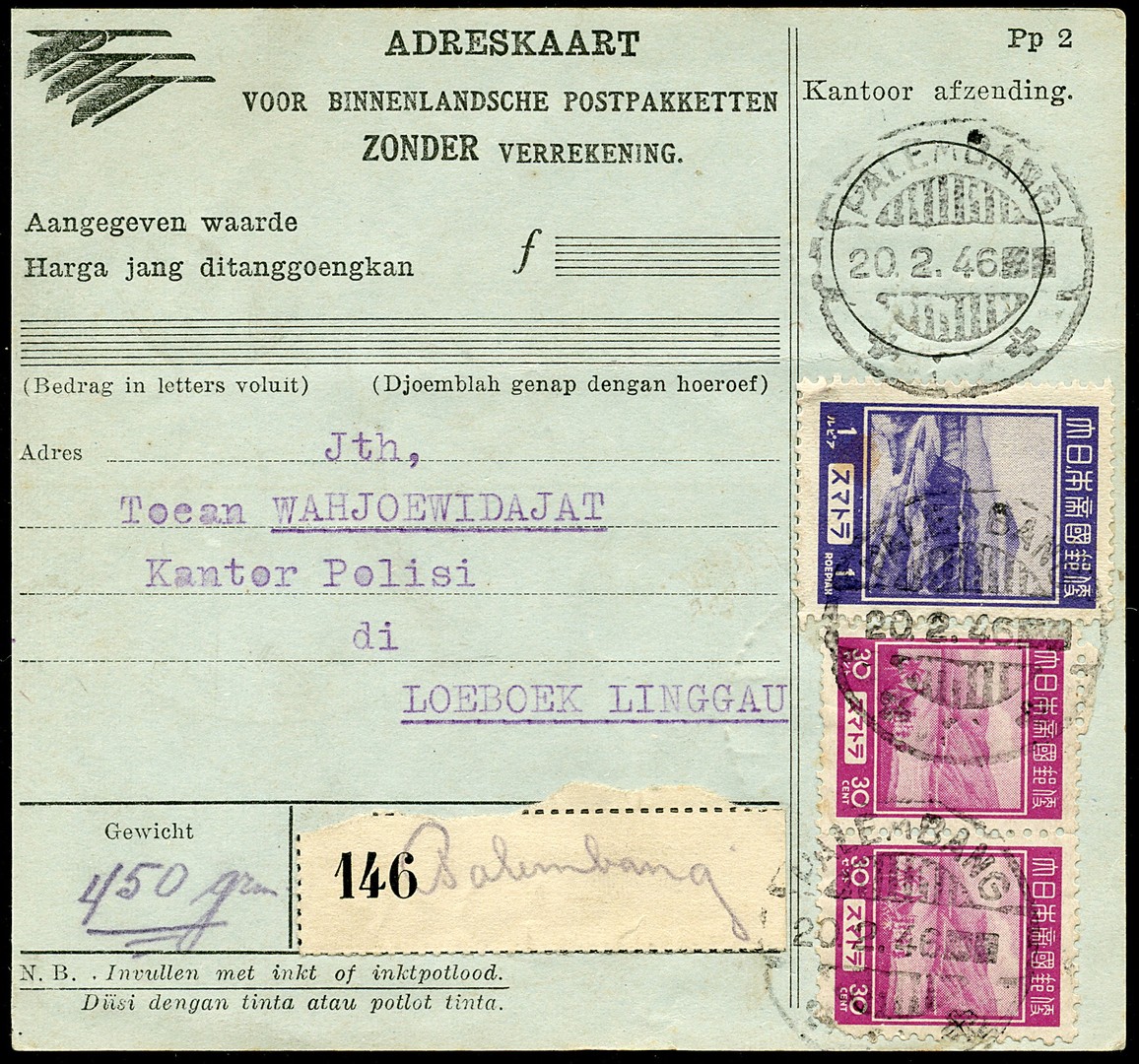 SUMATRA. Written postage 'ƒ 8.-' and postage paid mark Bu.RB12 on M.O. Bu.RF37a (scarce) from Serbalawan 27.7.46 to Tandjoengbalai 30.7.46 and 30 Cent in pair and 1 roepiah all without Republican overprint nos. 11-94, 97 on parcel post card Bu.RF40 (scarce) from Palembang 20.2.46 to Loeboek- / Linggau 26.2.46