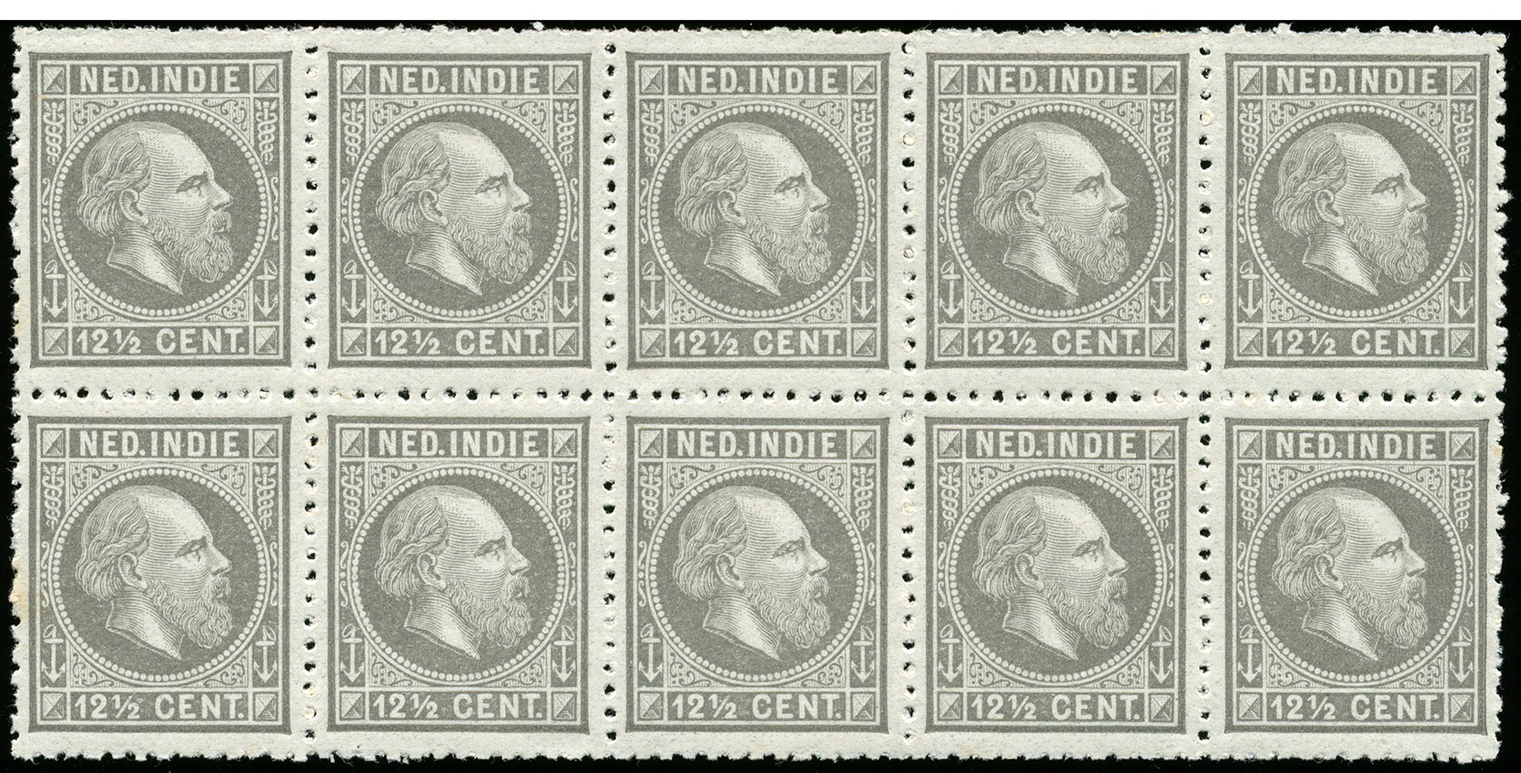 10H, 12½ Cent grijs in kamtanding 12½ kl.g. Postfris blok van tien met volle, originele gom en bijzonder mooi van kleur (zegel linksonder az. miniem bruin puntje). € 400