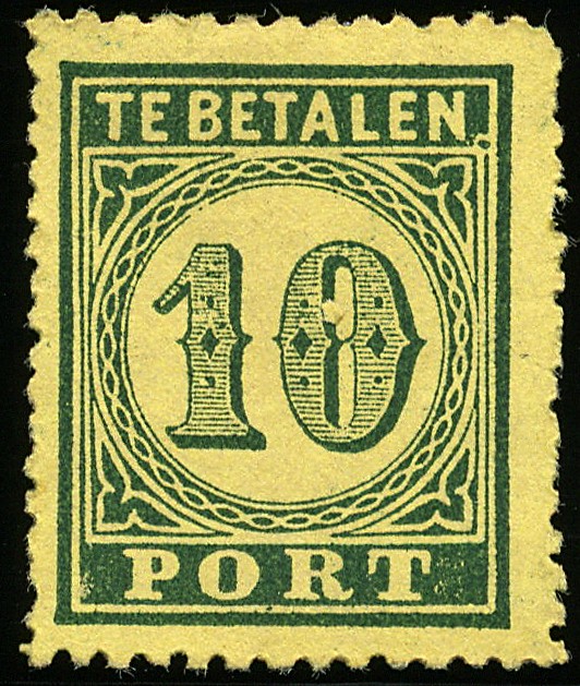 Port 2f, 10 cent groen op geel met plaatfout 'kringetje', ongebruikt prachtex. € 500