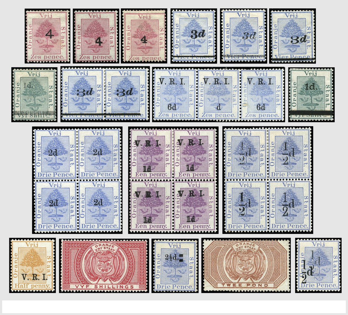 ENGELSE KOLONIËN, Oranje Vrijstaat o/*/**, prachtige zeer uitgebreide verzameling met talrijke opdrukvariëteiten en andere afwijkingen in paren, strippen, blokken van vier, div. printings, etc., tevens Fiscaalzegels en 11 briefkaarten met 'Shield'-stempel. Zelden zo aangeboden