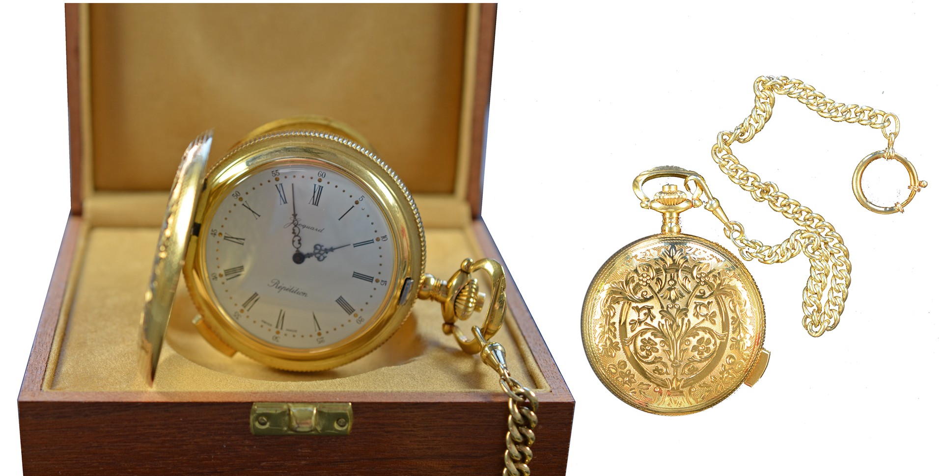 Origineel 18-karaats gouden zakhorloge 'Jacquard-Répétitions', inclusief 14-karaats gouden horloge-ketting. Het totale gewicht bedraagt ruim 184 gram waarvan de ketting ca. 33 gram, in originele houten kistje. De destijdse aanschafwaarde bedroeg het ruim 3-voudige van de inzetprijs!