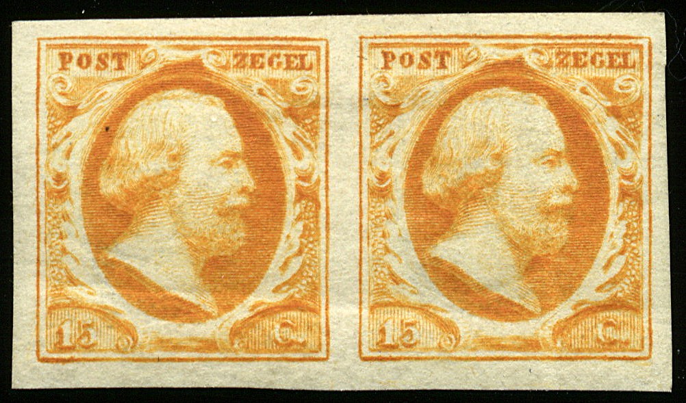 3a, 15 Cent donkergeeloranje, pos. 43/44 (?), breed gerand prachtpaar met volle, originele gom (waarin twee gomvouwen), zeer fris van kleur. Cert. ´Muis, 1977´. € 2400+