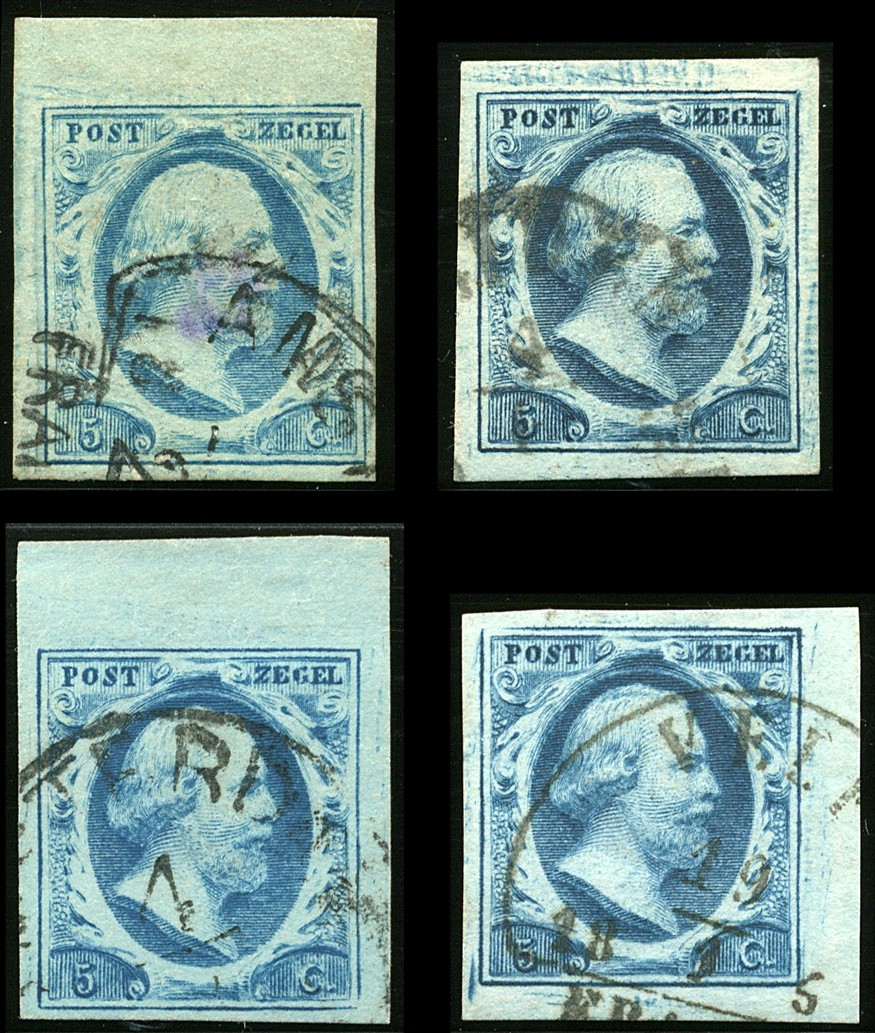 1j, 5 Cent plaat III in diverse nuances blauw, 8 losse zegels en 2 paren uit het linker onderkwadrant van een plaatreconstructie, posities 53, 55, 57, 58/59, 63, 64, 68, 70, 72/73 en 74. Uitsluitend prachtexemplaren in uitgezochte kwaliteit w.o. randstukken. € 800