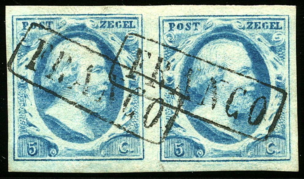 1q, 5 Cent plaat VI op dik papier, 9 mooi tot breed gerande prachtparen uit het rechter onder kwadrant van een plaatreconstructie, pos. 77/78, 78/79, 83/84, 86/87, 87/88, 89/90, 93/94, 94/95 en 96/97