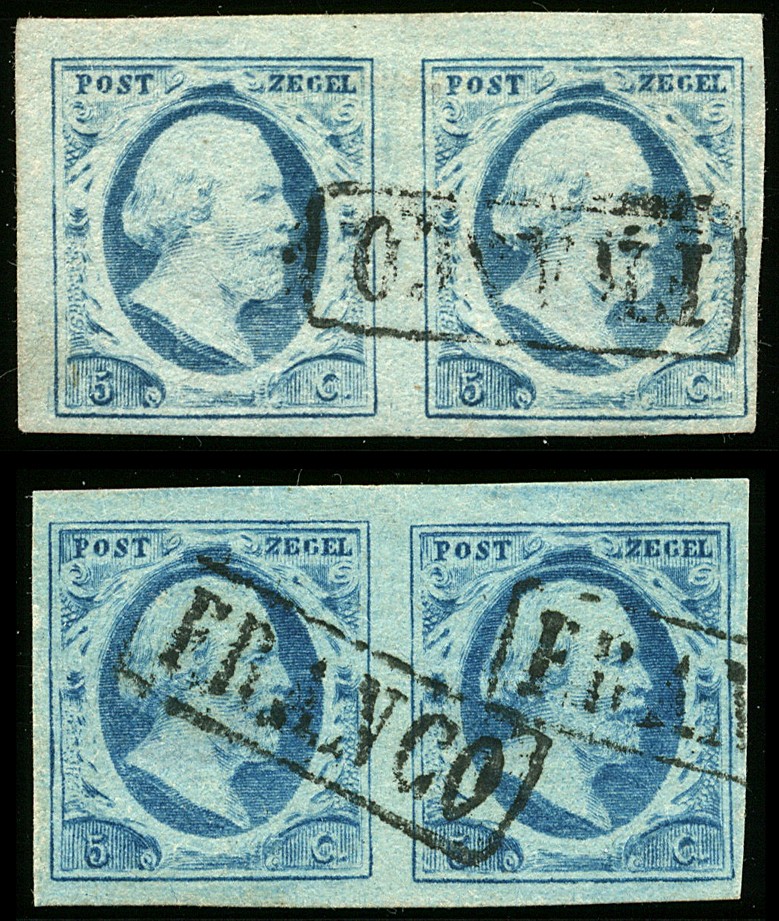1r, 5 Cent plaat VI op dun papier, 12 mooi tot breed gerande prachtparen w.o. met velrand uit het rechter onder kwadrant van een plaatreconstructie, pos. 76/77, 79/80, 81/82, 82/83, 84/85, 86/87, 87/88, 88/89, 93/94, 94/95, 98/99 en 99/100