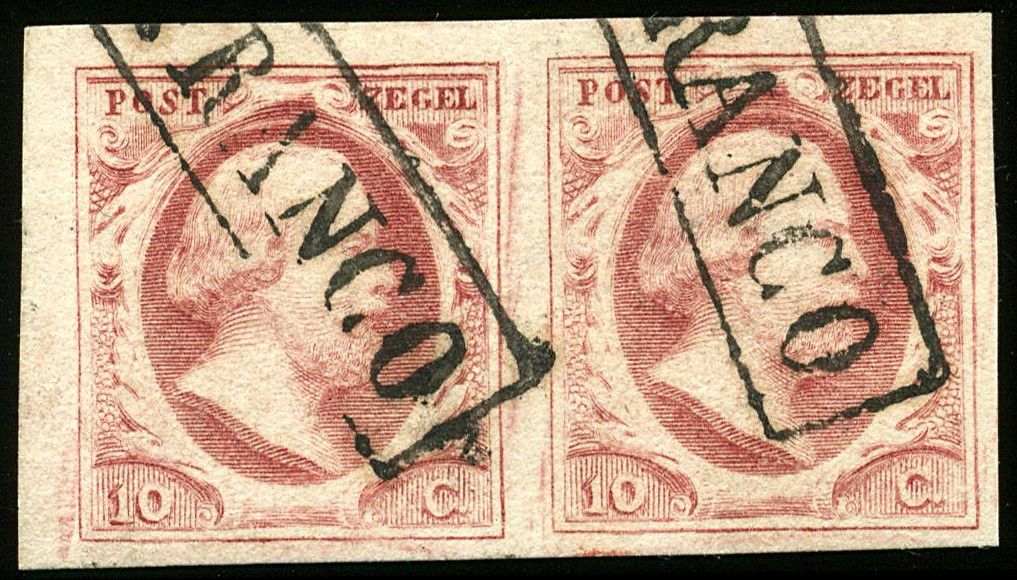2p, 10 Cent plaat X op dik papier, 9 mooi tot zeer breed gerande prachtparen uit het rechter onder kwadrant van een plaatreconstructie, pos. 76/77, 82/83, 84/85, 86/87, 89/90, 91/92, 93/94, 94/95 en 96/97