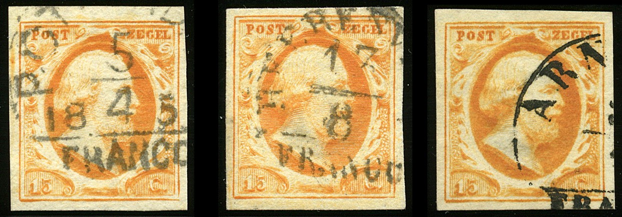 3a/b, 15 Cent in donkergeeloranje en donkeroranje, 10 losse zegels uit het linker onderkwadrant van een plaatreconstructie, pos. 51, 53, 54 (?), 60, 63, 64, 65, 66, 72 en 74. Uitsluitend prachtexemplaren in uitgezochte kwaliteit. € 2250+