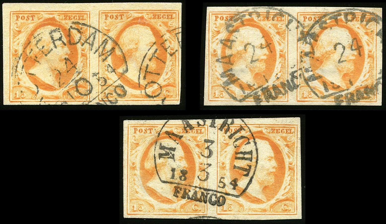 3b/d, 15 Cent, 5 redelijk tot breed gerande prachtparen uit het rechter onderkwadrant van een plaatreconstructie, pos. 66/67, 79/80, 84/85, 89/90 en 94/95