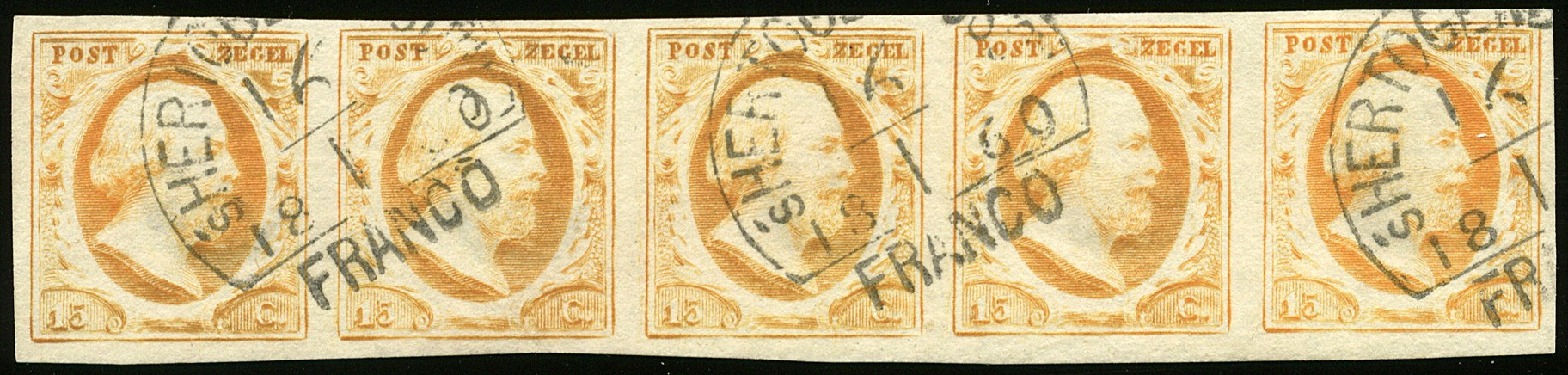 3c, pos. 6/10. Mooi tot breed gerande, keurig en scherp te ´sHertogenbosch afgestempelde, schitterende prachtstrip van vijf. € 3000