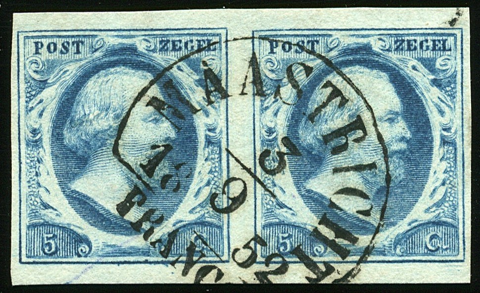 MAASTRICHT B (kleine cijfers, type 1, EY.50) op 5 cent nr. 1b-Pl.I-69/70. Prachtpaar met volledige afst.